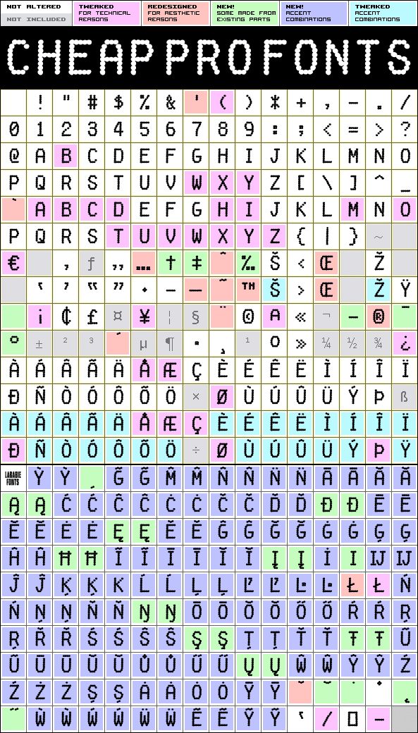 I have mirrored the symmetrical characters for the lowercase - allowing for a slightly more varied look. In addition to correcting and expanding the character set, of course. Ray Larabie says: «An all caps, distressed dot matrix font; the type often seen on cash register receipts.»